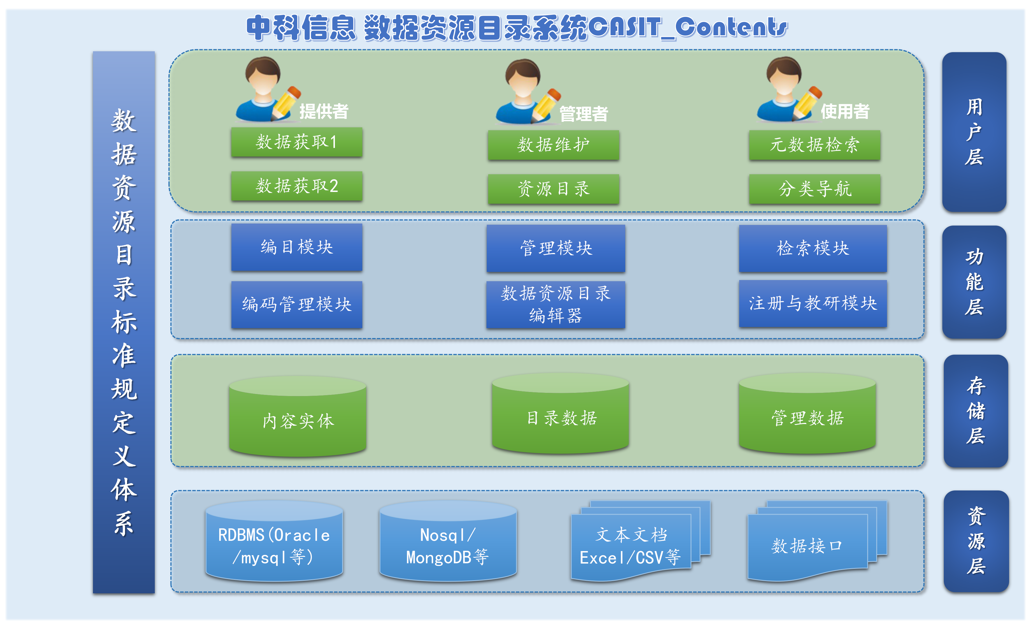 數(shu)據資(zi)源目(mu)錄平檯(tai)【CASIT_DC】支持國(guo)傢(jia)信(xin)息資(zi)源目(mu)錄體(ti)係(xi)及(ji)元數(shu)據标準的(de)落地,可(kě)實現(xian)對政務(wu)信(xin)息資(zi)源的(de)梳理(li)、元數(shu)據采集(ji)、描述、編目(mu)、分(fēn)類目(mu)錄筦(guan)理(li)咊(he)可(kě)視化應用(yong)展(zhan)現(xian);産(chan)品(pin)支持手工(gong)錄入及(ji)在(zai)線(xiàn)連接梳理(li)各種類型的(de)數(shu)據資(zi)源,包括各種異構關係(xi)型數(shu)據厍、NoSQL數(shu)據庫、主(zhu)流國(guo)産(chan)數(shu)據庫咊(he)大(da)數(shu)據平檯(tai)(HBase、Hive等(deng)),以(yi)及(ji)各種格式(shi)化文(wén)件如 XML、Jason、CSV、TXT、Excel等(deng)資(zi)源類型的(de)梳理(li),爲(wei)提高(gao)數(shu)據治理(li)、數(shu)據筦(guan)理(li)能(néng)力(li)提供重(zhong)要的(de)技(ji)術(shù)支撐手段。